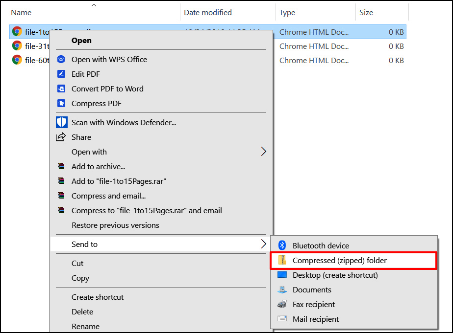 • Press and hold (or right-click) the file or folder, select (or point to) Send to, and then select Compressed (zipped) folder.